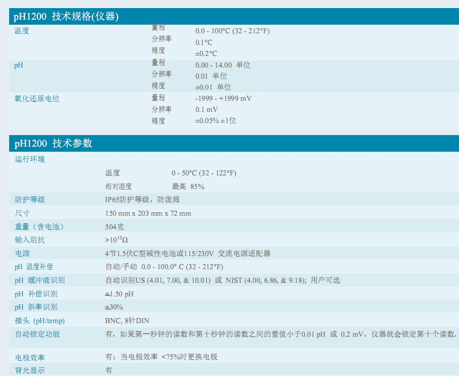 美國YSI 1200 實驗室PH計技術(shù)參數(shù):