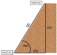 該簡(jiǎn)單測(cè)量程序提示你對(duì)目標(biāo)進(jìn)行兩次測(cè)量: "Shot 1” 和 “Shot 2”. 圖柏斯TruPulse 利用結(jié)果計(jì)算兩點(diǎn)間的四個(gè)參數(shù)值: HD, VD, SD, INC.如上圖3、4所示: